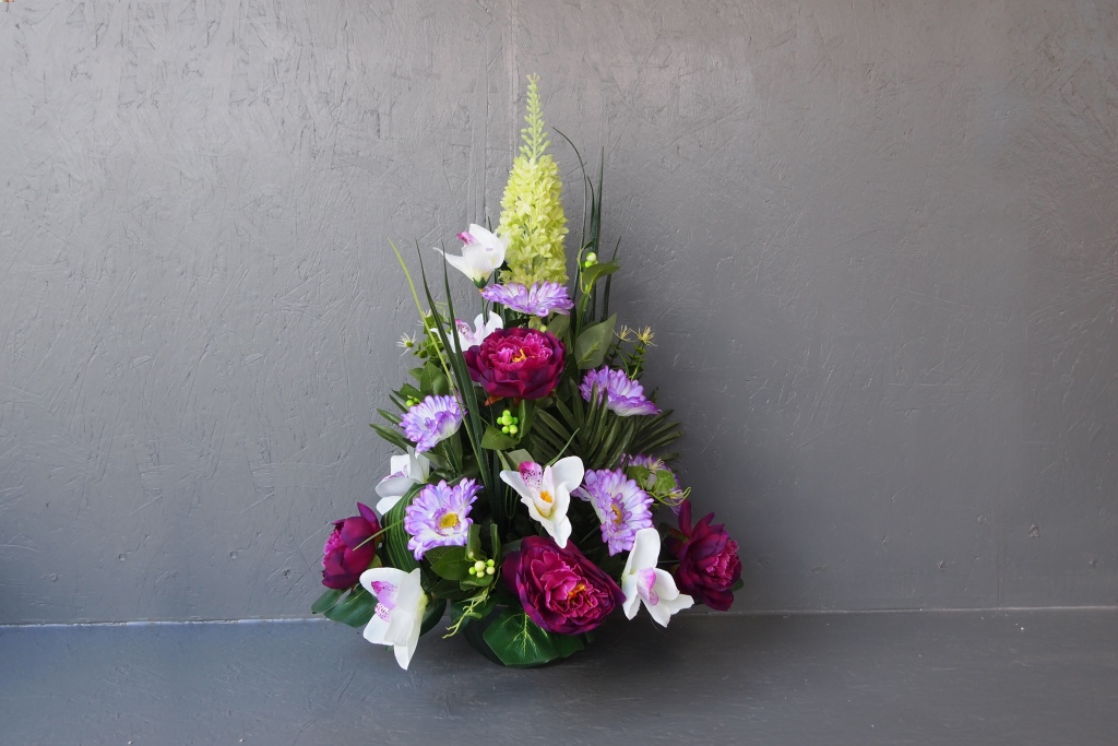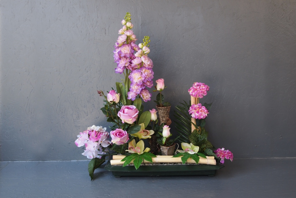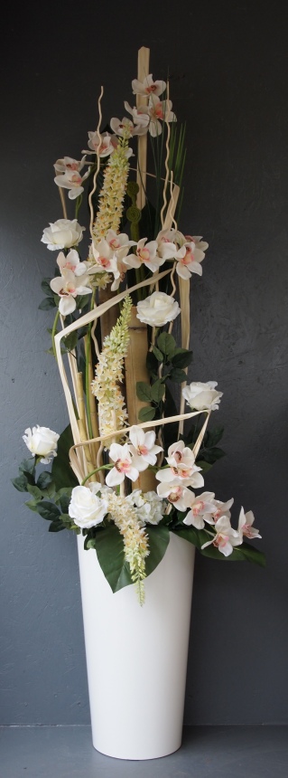 Très travaillées, ces compositions sont déclinées en plusieurs coloris et différents contenants (jardinières, coupes, pots, cônes).
